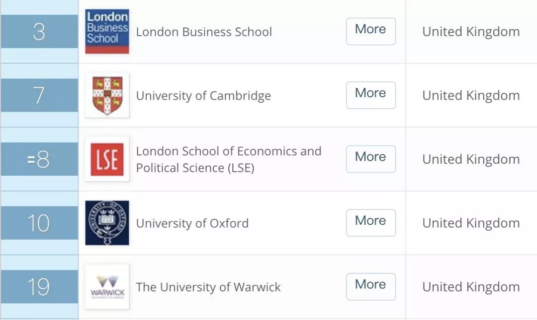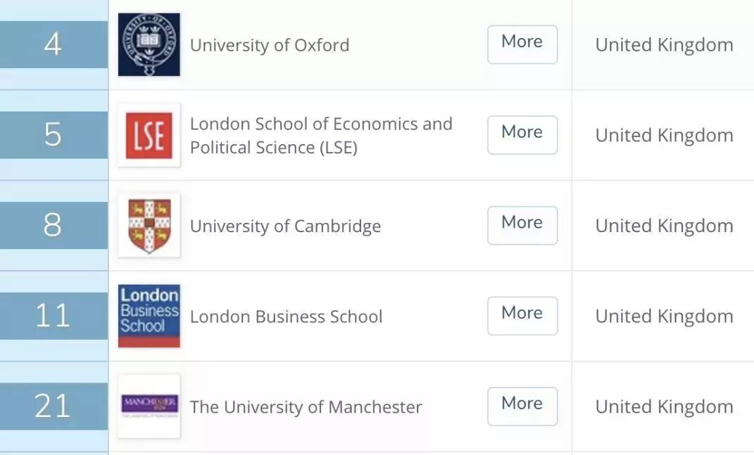 具体来说,在榜单TOP10 的大学中,有5所美国大学,4所英国大学,1所瑞士大学。英国依然是当今世界上提供最优质高等教育的国家之一。