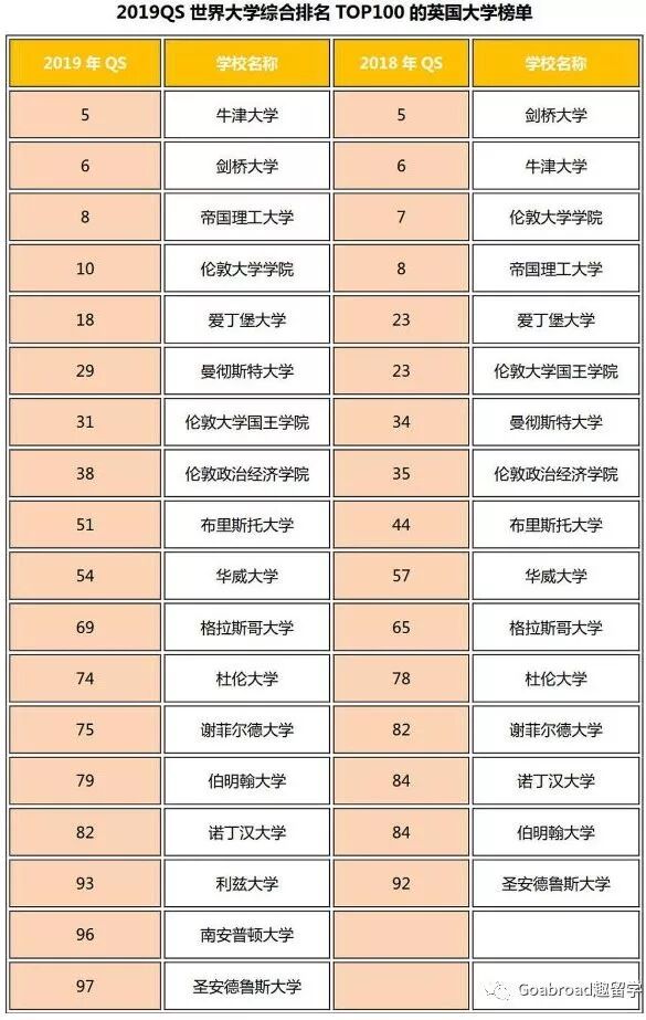 QS 2019世界大学排名中,共有18所英国院校位列世界排名前100,比2018年增加了2所,分别是利兹大学和南安普顿大学。